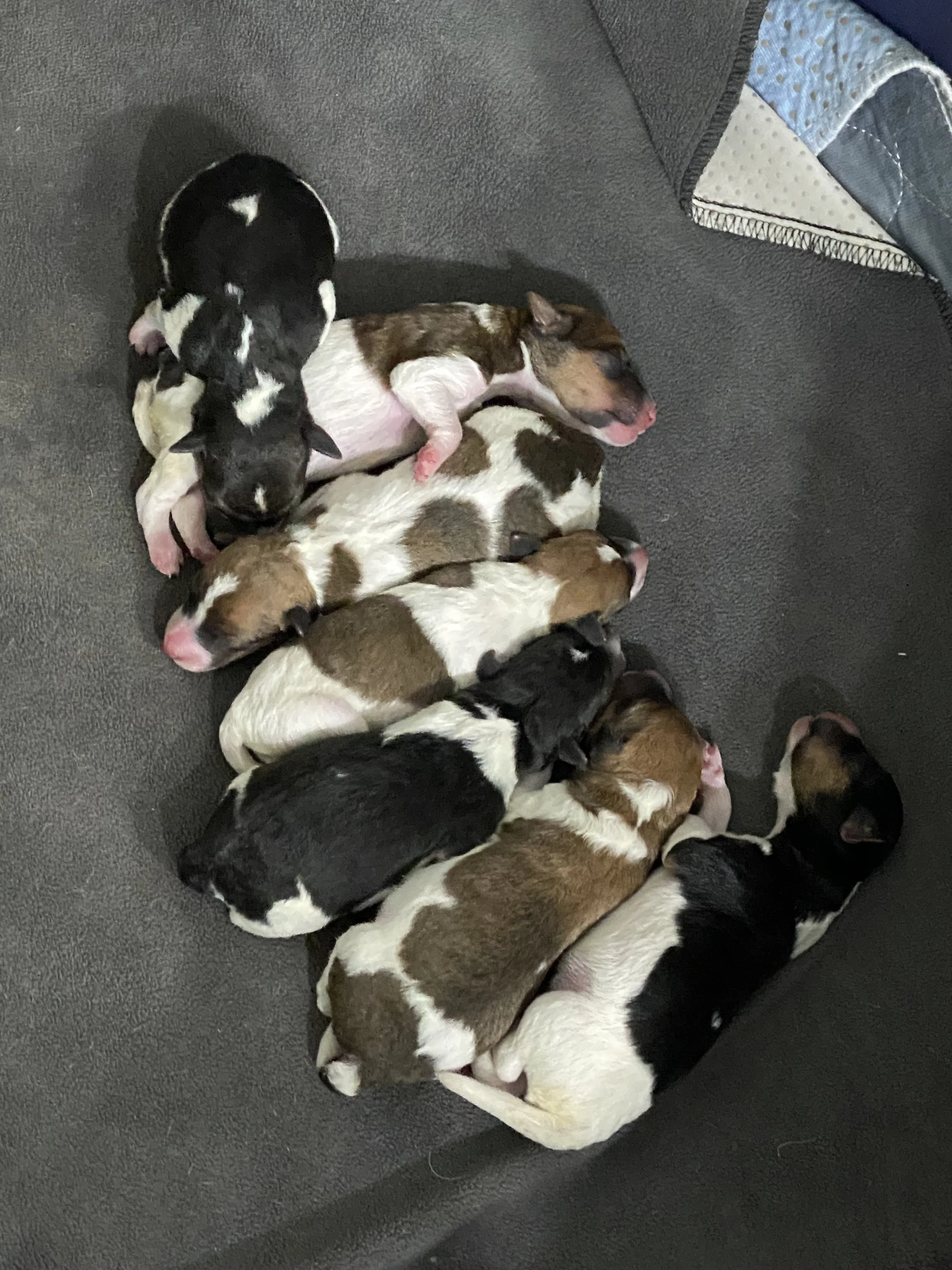 Ginger and her STUPENDOUS SEVEN-4 boys & three girls…life is GOOD! Puppies will be ready to go home the weekend before Christmas…!
